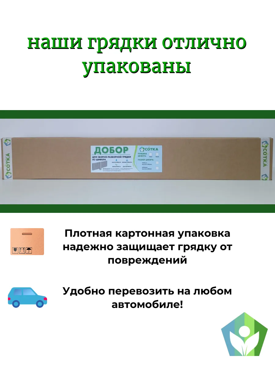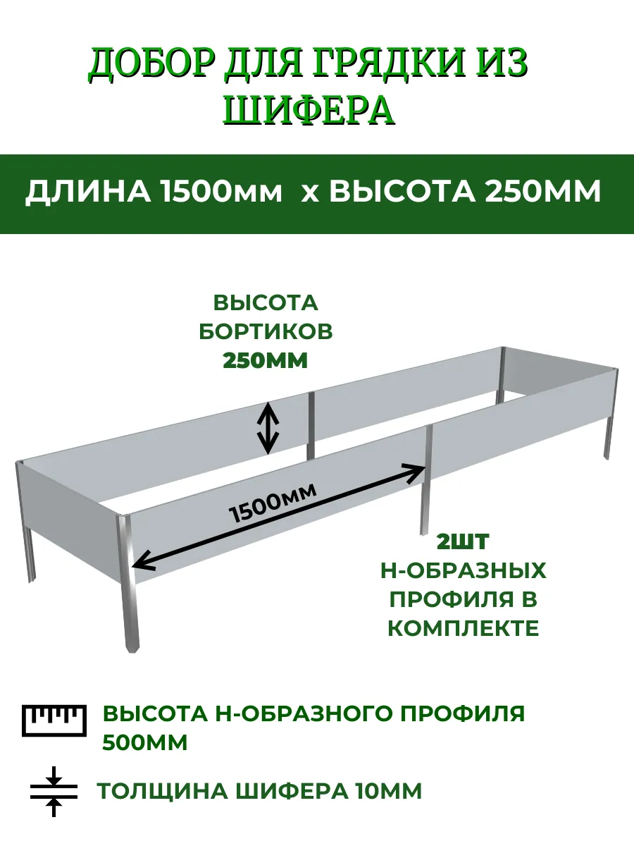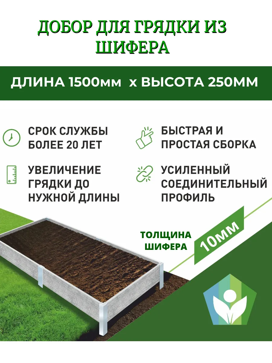 Доборы для грядки из шифера с н-образным профилем в комплекте. В комплект входят боковые полосы из шифера толщиной 10мм,соединительный алюминиевый профиль. Длина добора 1.5м. С помощью данного добора возможно увеличение длины грядки до нужного размера. Определенный тип профиля позволяет производить монтаж конструкции без саморезов и дополнительных инструментов. Комплекты собраны из влагостойких, прочных и морозостойких материалов. Срок службы таких полос в земле очень продолжительный. Высота 250мм подходит для сборки универсальных грядок. Установив такие грядки на огороде вы решаете проблему ненавистных сорняков, увеличиваете объем урожая, сокращаете сроки созревания овощей. Ваш огород выглядит красиво и ухожено.