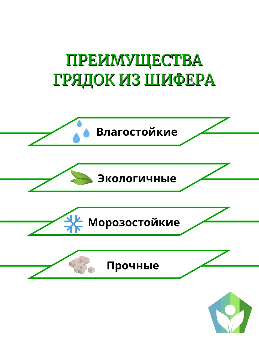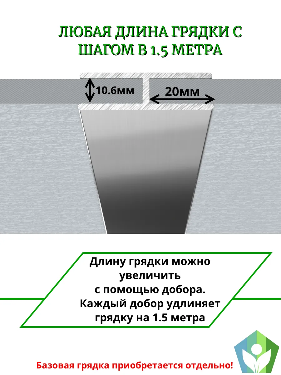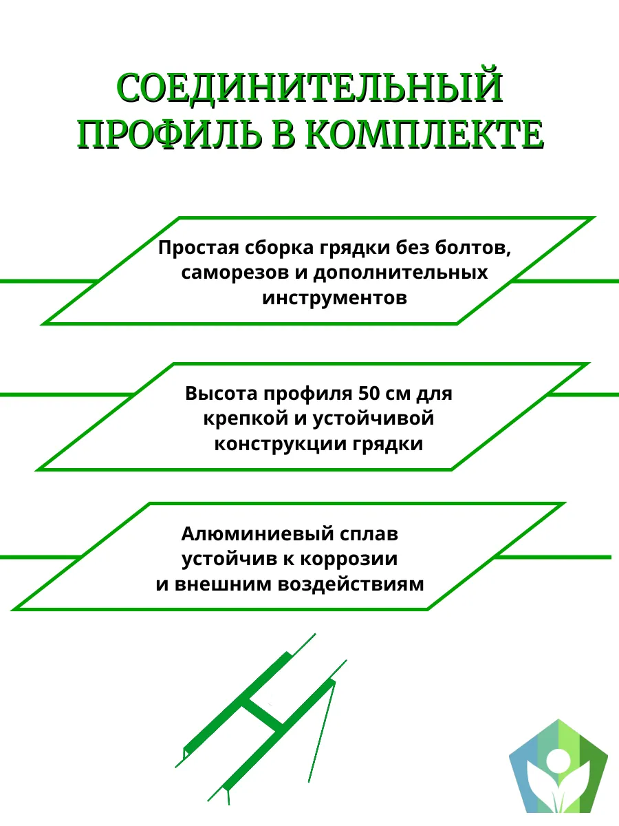 Доборы для грядки из шифера с н-образным профилем в комплекте. В комплект входят боковые полосы из шифера толщиной 10мм,соединительный алюминиевый профиль. Длина добора 1.5м. С помощью данного добора возможно увеличение длины грядки до нужного размера. Определенный тип профиля позволяет производить монтаж конструкции без саморезов и дополнительных инструментов. Комплекты собраны из влагостойких, прочных и морозостойких материалов. Срок службы таких полос в земле очень продолжительный. Высота 250мм подходит для сборки универсальных грядок. Установив такие грядки на огороде вы решаете проблему ненавистных сорняков, увеличиваете объем урожая, сокращаете сроки созревания овощей. Ваш огород выглядит красиво и ухожено.