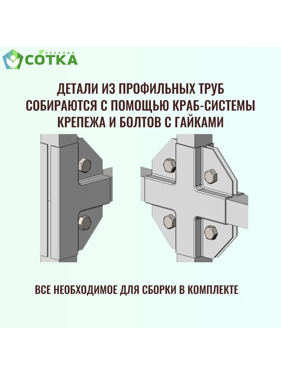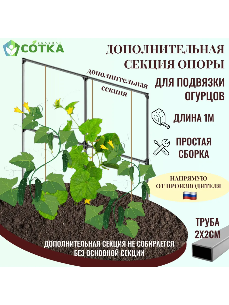 Длина дополнительной секции опоры 1 метр. Каркас опоры изготовлен из оцинкованной профильной стальной трубы и состоит из двух горизонтальных перекладин, двух составных стоек, двух ограничителей и двух колов (для заглубления опоры в землю). Комплект краб-соединений для сборки каркаса, крепеж и заглушки. Все крепежные элементы имеют антикоррозийное покрытие.