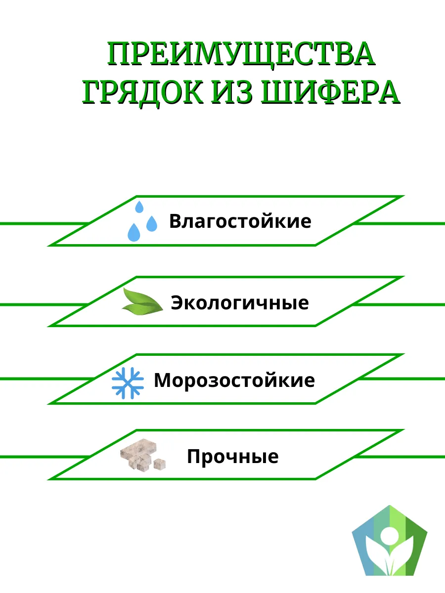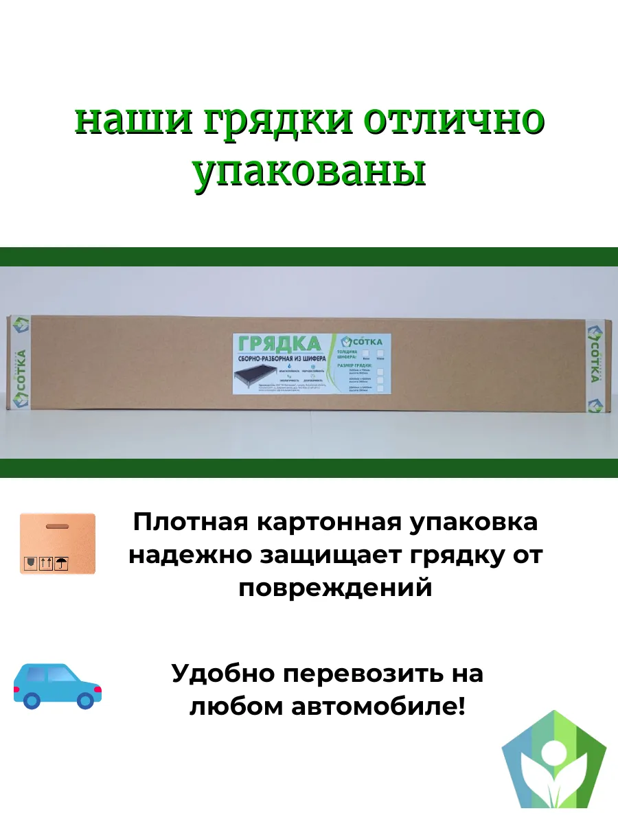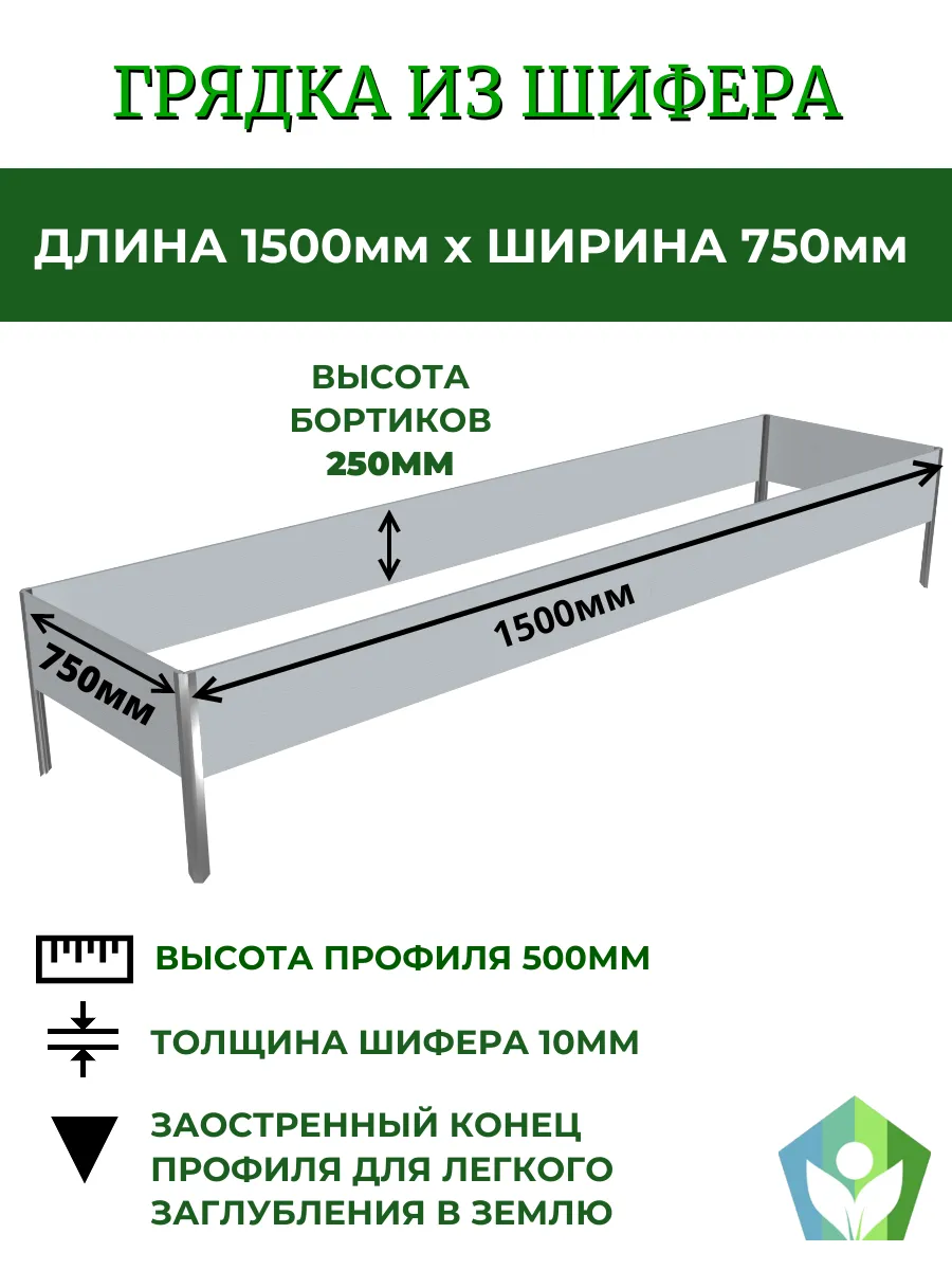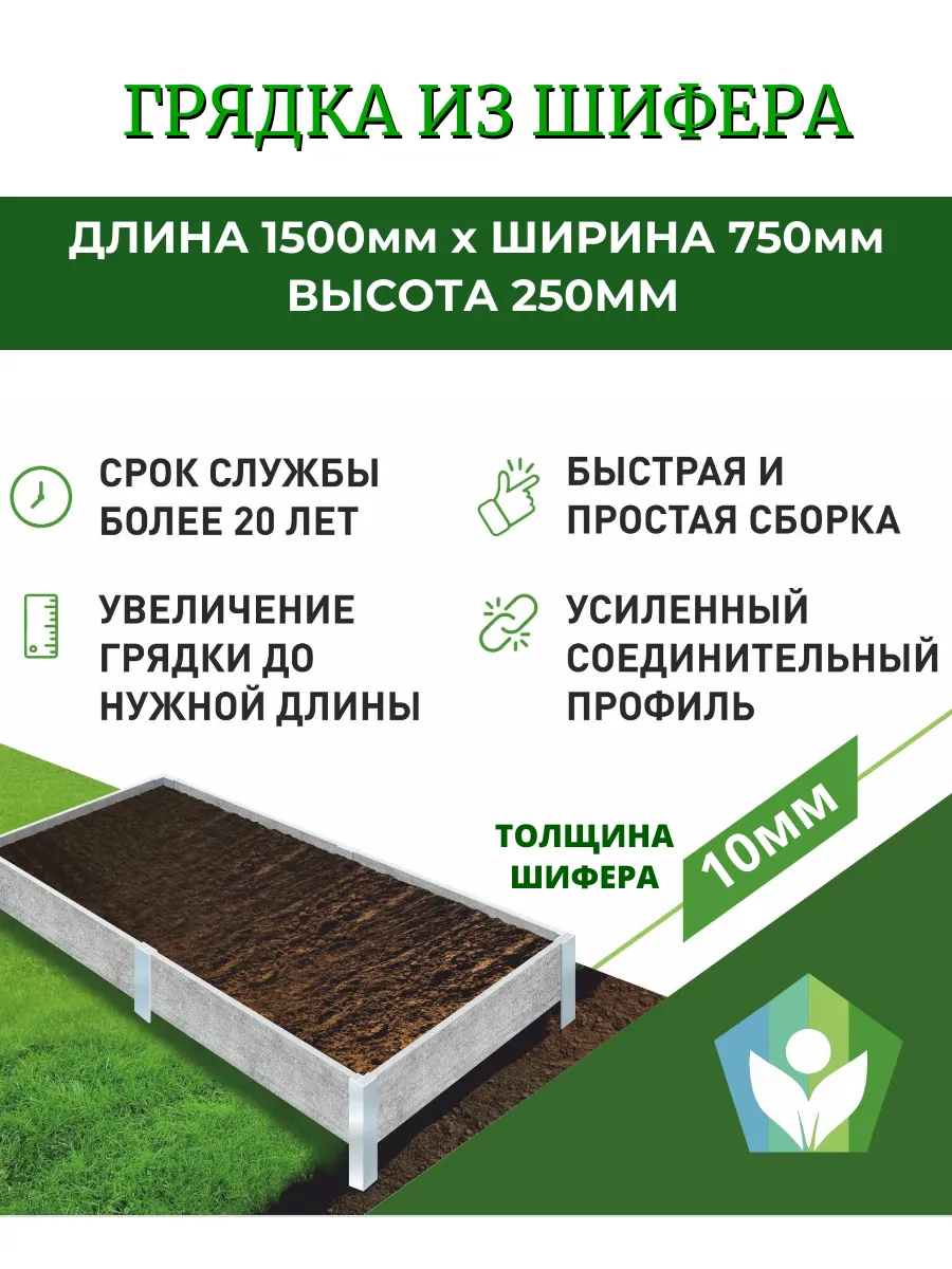 Сборно-разборные грядки из шифера с соединительным алюминиевым профилем в комплекте, длина 1500мм х ширина 750мм х высота 300мм. В комплект входят боковые и торцевые полосы из шифера толщиной 10мм,соединительный алюминиевый профиль. Определенный тип профиля позволяет производить монтаж конструкции без саморезов и дополнительных инструментов. До нужной длины, грядку можно увеличить с помощью добора с шагом в 1.5м.Добор для удлинения грядки заказывается отдельно. Комплекты собраны из влагостойких, прочных и морозостойких материалов. Срок службы таких полос в земле очень продолжительный. Высота 200мм подходит для сборки классических грядок универсального размера. Установив такие грядки на огороде вы решаете проблему ненавистных сорняков, увеличиваете объем урожая, сокращаете сроки созревания овощей. Ваш огород выглядит красиво и ухожено.