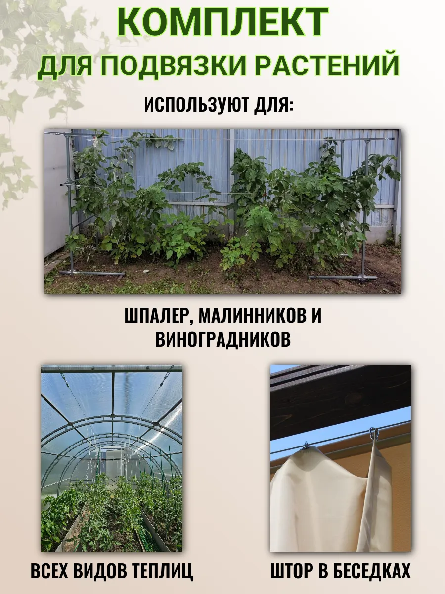 Комплект для подвязки растений рассчитан для применения на шпалерах, в теплиц и парниках. В комплект входят 2 троса длиной 4.2 метра, 2 талрепа, 4 зажима. Диаметр троса с ПВХ покрытием 3 мм. Универсальный трос предназначен для подвязки таких растений как томаты, огурцы, перец, баклажаны. Для подвязки малины, ежевики на шпалерах и виноградников. Монтируется данный комплект легко и просто и не требует демонтажа на зимний период.