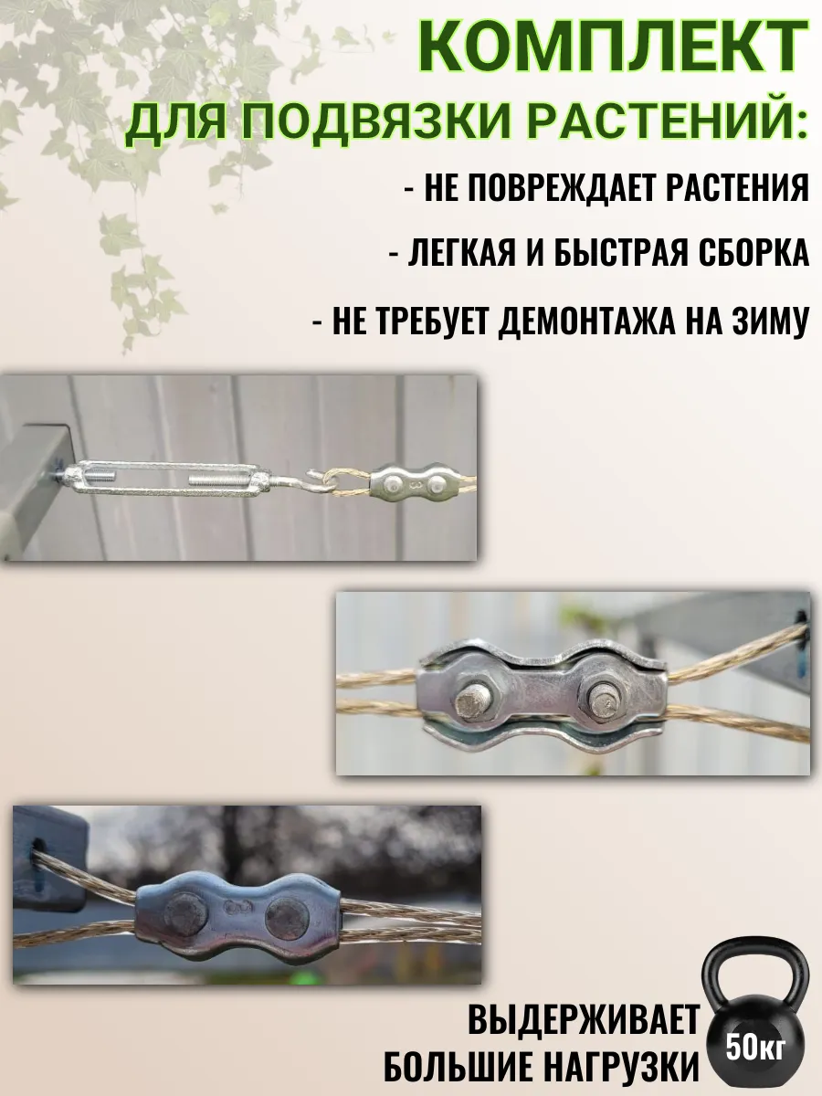Комплект для подвязки растений рассчитан для применения на шпалерах, в теплиц и парниках. В комплект входят 2 троса длиной 6.2 метра, 2 талрепа, 4 зажима. Диаметр троса с ПВХ покрытием 3 мм. Универсальный трос предназначен для подвязки таких растений как томаты, огурцы, перец, баклажаны. Для подвязки малины, ежевики на шпалерах и виноградников. Монтируется данный комплект легко и просто и не требует демонтажа на зимний период.