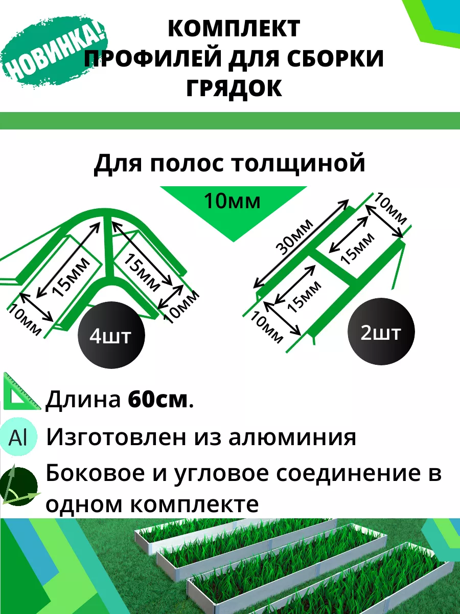 Комплект алюминиевых соединительных профилей для сборки грядок в теплице и открытом грунте. Профиль рассчитан на толщину материала (шифер, цсп и др.) не более 10 мм! Соединительный профиль разработан таким образом, чтобы сборка грядки была максимальна проста и удобна покупателям. Комплект профилей служит для соединения углов и боковин грядки. Сборка грядки занимает не более 30 минут, без саморезов и не требует специальных инструментов. Высота профиля 60 см, позволяет заглубить его в землю и создать дополнительные опоры для грядки. Данный комплект отлично подходит для сборки высоких грядок. Глубина пазов профиля 15мм. Профиль изготовлен из алюминия, который имеет ряд преимуществ:
