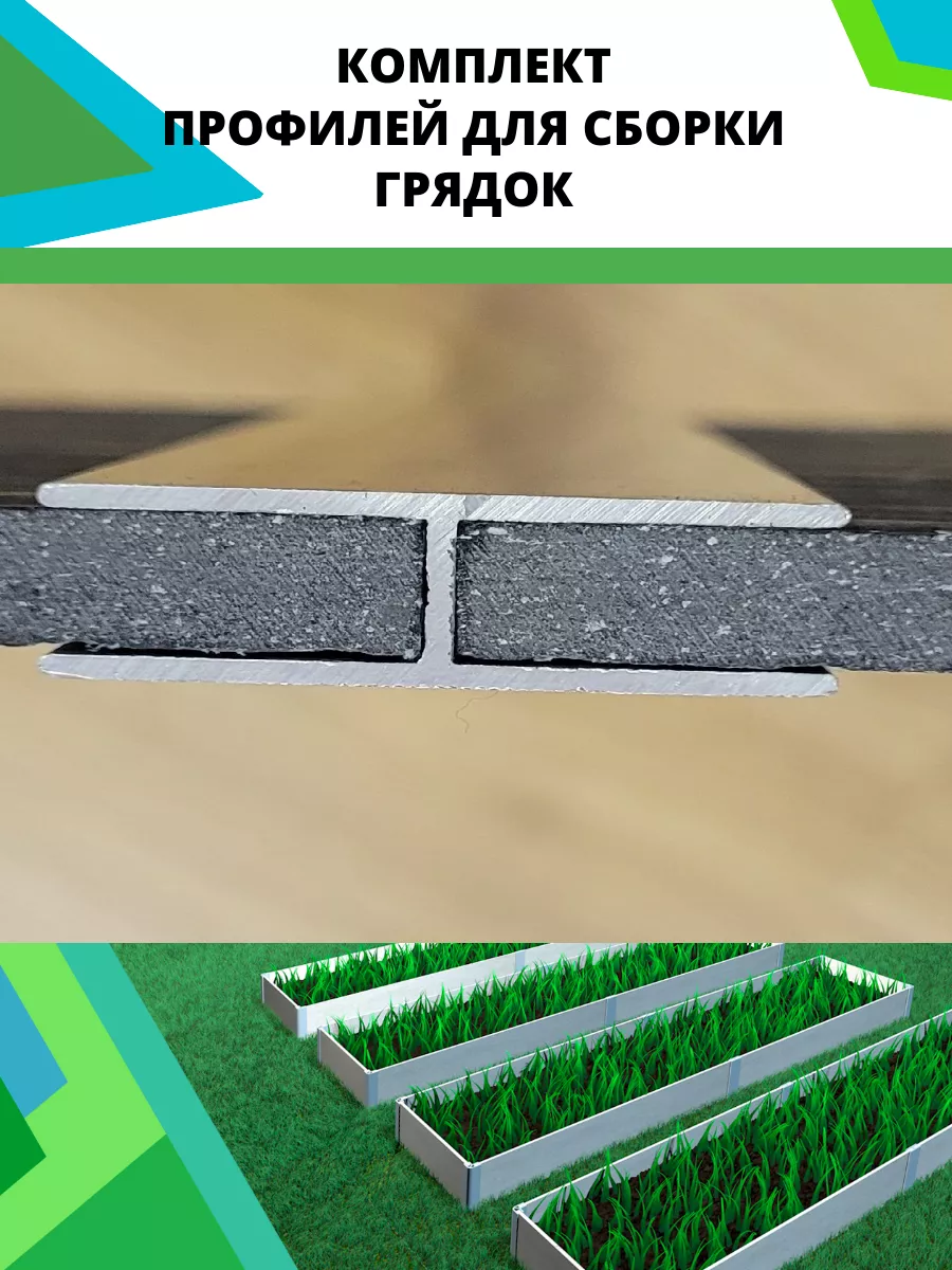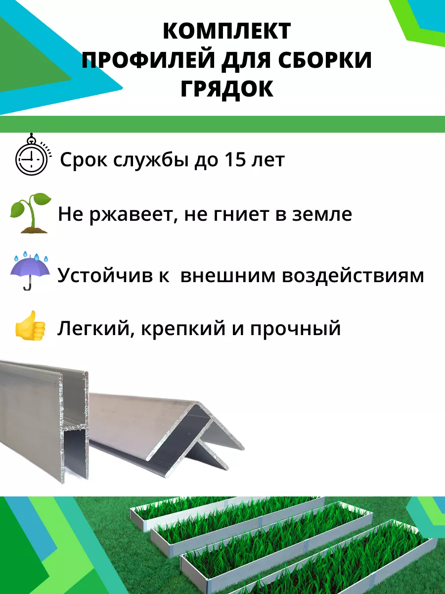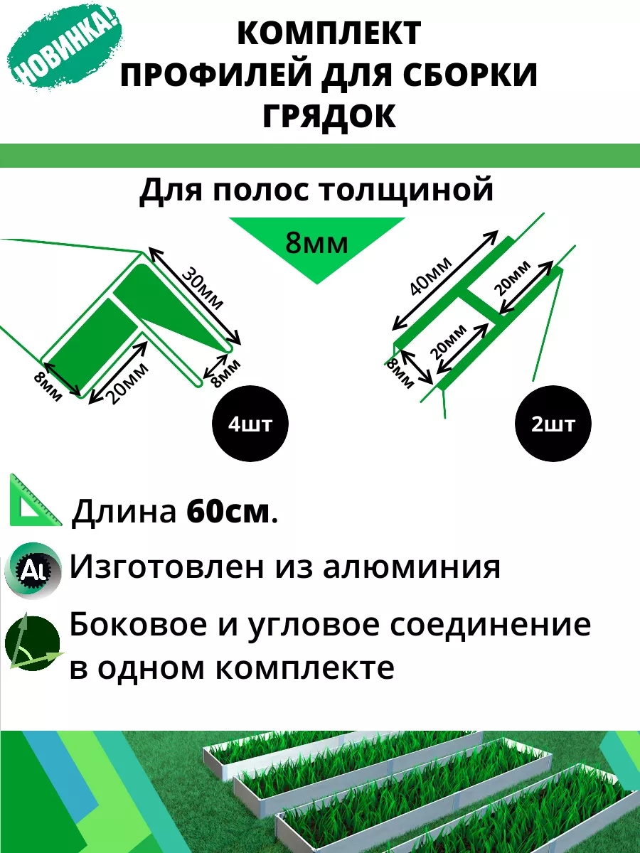 Комплект алюминиевых соединительных профилей для сборки грядок в теплице и открытом грунте. Профиль рассчитан на толщину материала (шифер, цсп и др.) не более 8 мм! Соединительный профиль разработан таким образом, чтобы сборка грядки была максимальна проста и удобна покупателям. Комплект профилей служит для соединения углов и боковин грядки. Сборка грядки занимает не более 30 минут, без саморезов и не требует специальных инструментов. Высота профиля 60 см, позволяет заглубить его в землю и создать дополнительные опоры для грядки. Данный комплект отлично подходит для сборки высоких грядок. Профиль изготовлен из алюминия, который имеет ряд преимуществ: