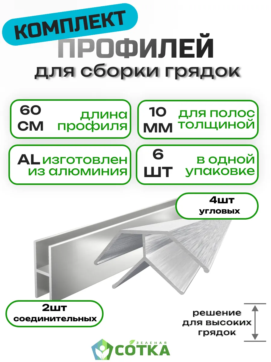 Бренд "Зеленая Сотка" представляет вашему вниманию комплект профилей "Премиум", который станет отличным решением для создания прочных, долговечных и функциональных грядок. В комплект входят 4 угловых и 2 соединительных профиля. Профиль имеет глубокие пазы шириной 10.6мм и идеально подходит для полос шифера, цсп и прочих листовых материалов толщиной 10мм.