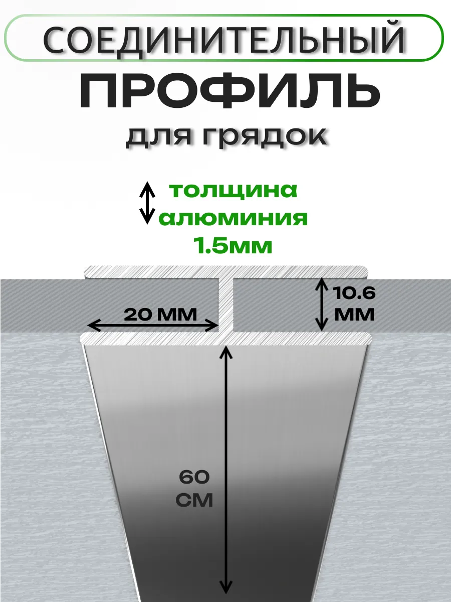 Профиль изготовлен из алюминия , который не поддается коррозии и сохраняет свой первоначальный вид надолго. Толщина стенок профиля 1,5мм, длина 60см. Благодаря такой длине, профиль используется как для сборки стандартных грядок, так и высоких.
