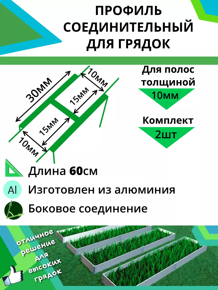 Комплект алюминиевых соединительных профилей для сборки грядок в теплице и открытом грунте. Профиль рассчитан на толщину материала (шифер, цсп и др.) не более 10мм! Соединительный профиль разработан таким образом, чтобы сборка грядки была максимальна проста и удобна покупателям. Комплект профилей служит для соединения углов и боковин грядки. Сборка грядки занимает не более 30 минут, без саморезов и не требует специальных инструментов. Высота профиля 60 см, позволяет заглубить его в землю и создать дополнительные опоры для грядки. Данный комплект отлично подходит для сборки высоких грядок. Профиль изготовлен из алюминия, который имеет ряд преимуществ:
