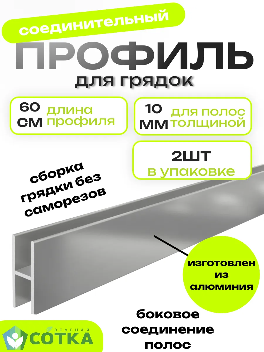 Комплект алюминиевых соединительных профилей для сборки грядок в теплице и открытом грунте. Профиль рассчитан на толщину материала (шифер, цсп и др.) не более 10 мм! Соединительный профиль разработан таким образом, чтобы сборка грядки была максимальна проста и удобна покупателям. Н-образный профиль служит для соединения боковин грядки. Сборка грядки: занимает не более 30 минут, без саморезов и не требует специальных инструментов. Высота профиля 60 см, позволяет заглубить его в землю и создать высокие грядки. В данной модели профиля глубина пазов увеличена до 2х сантиметров с каждой стороны . Профиль изготовлен из алюминия, который имеет ряд преимуществ: