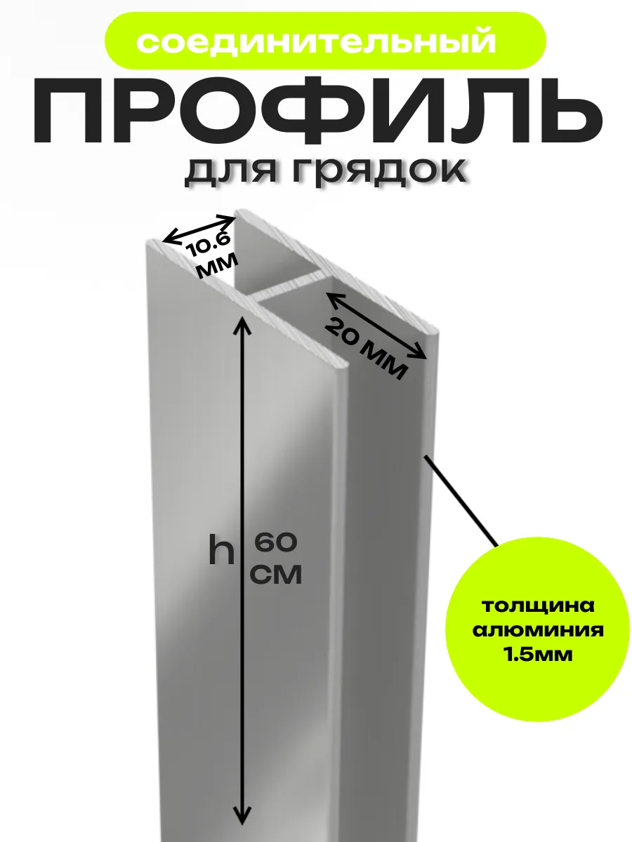 Комплект алюминиевых соединительных профилей для сборки грядок в теплице и открытом грунте. Профиль рассчитан на толщину материала (шифер, цсп и др.) не более 10 мм! Соединительный профиль разработан таким образом, чтобы сборка грядки была максимальна проста и удобна покупателям. Н-образный профиль служит для соединения боковин грядки. Сборка грядки: занимает не более 30 минут, без саморезов и не требует специальных инструментов. Высота профиля 60 см, позволяет заглубить его в землю и создать высокие грядки. В данной модели профиля глубина пазов увеличена до 2х сантиметров с каждой стороны . Профиль изготовлен из алюминия, который имеет ряд преимуществ: