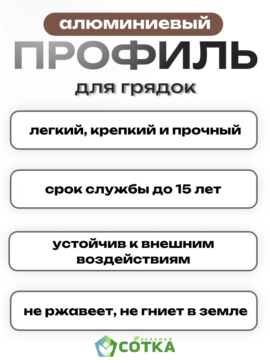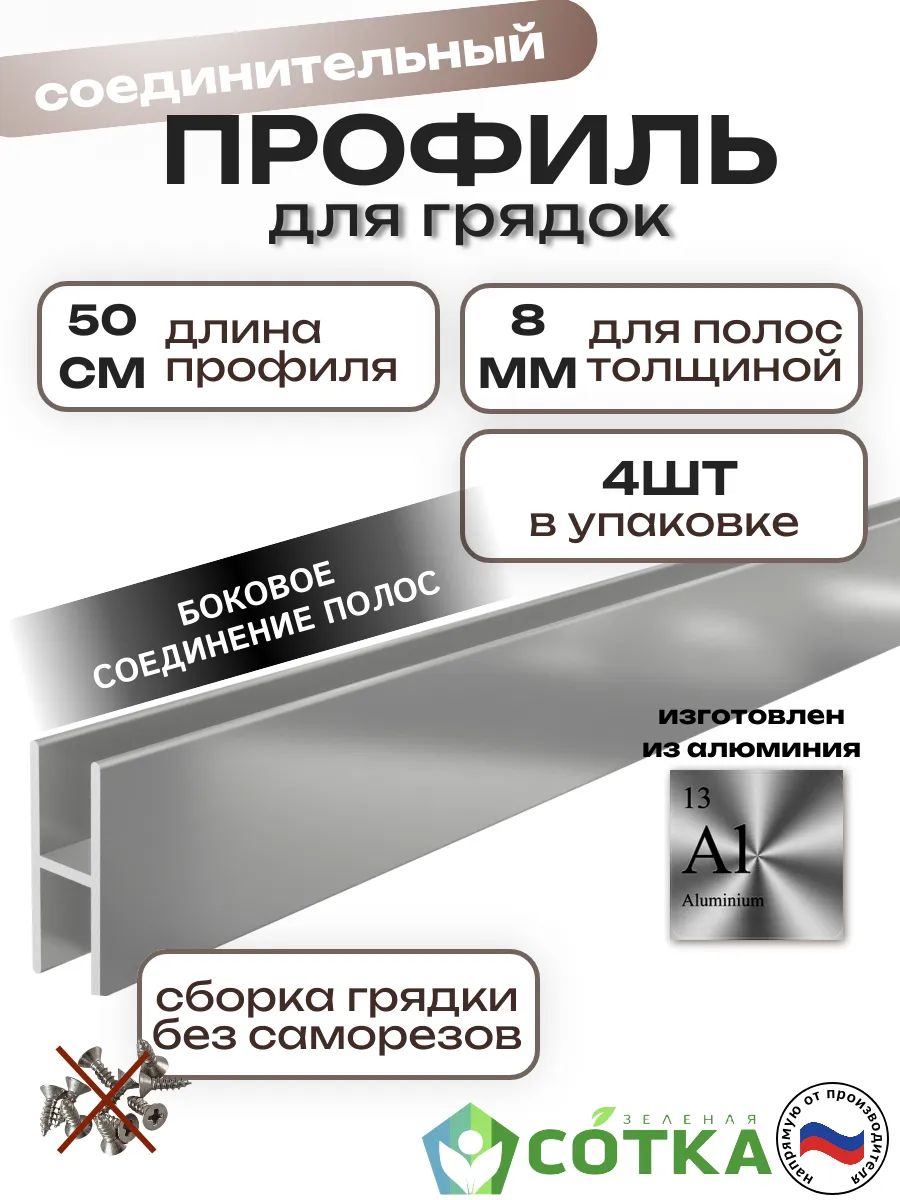 Комплект алюминиевых соединительных профилей для сборки грядок в теплице и открытом грунте. Профиль рассчитан на толщину материала (шифер, цсп и др.) не более 8 мм! Соединительный профиль разработан таким образом, чтобы сборка грядки была максимальна проста и удобна покупателям. Сборка грядки: занимает не более 30 минут, без саморезов и не требует специальных инструментов Н-образный профиль служит для соединения боковин грядки. Высота профиля 50 см, позволяет заглубить его в землю и создать дополнительные опоры для грядки. Увеличенная глубина пазов 2 см.