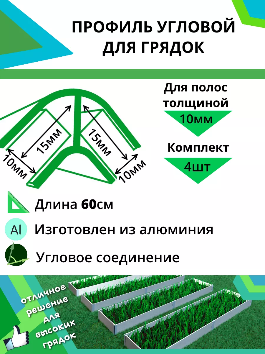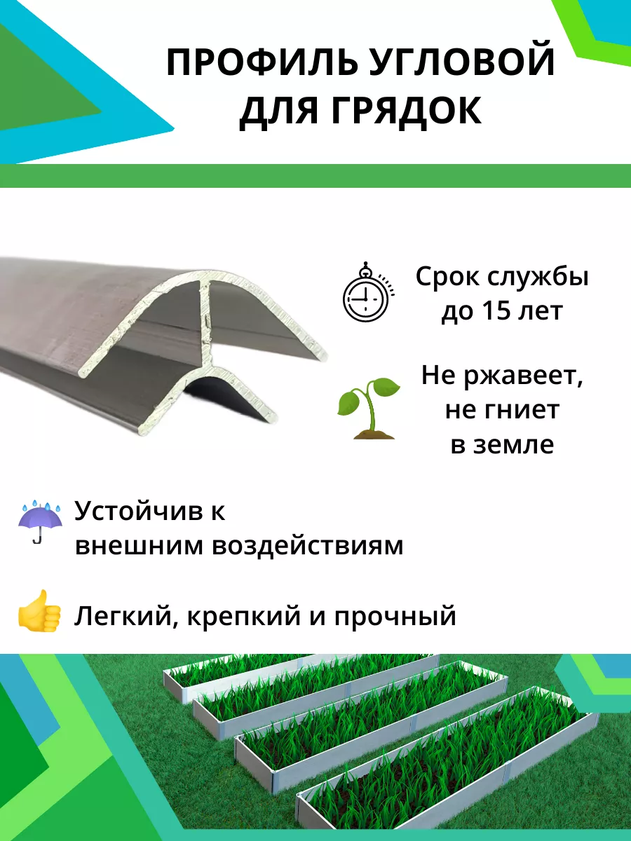 Комплект алюминиевых угловых профилей для сборки грядок в теплице и открытом грунте. Профиль рассчитан на толщину материала (шифер, цсп и др.) не более 10мм! Соединительный профиль разработан таким образом, чтобы сборка грядки была максимальна проста и удобна покупателям. Комплект профилей служит для соединения углов и боковин грядки. Сборка грядки занимает не более 30 минут, без саморезов и не требует специальных инструментов. Высота профиля 60 см, позволяет заглубить его в землю и создать дополнительные опоры для грядки. Данный комплект отлично подходит для сборки высоких грядок. Профиль изготовлен из алюминия, который имеет ряд преимуществ:
