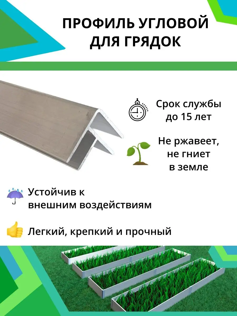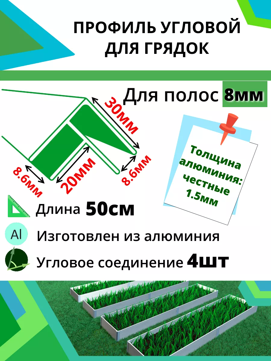 Комплект алюминиевых соединительных угловых профилей для сборки грядок в теплице и открытом грунте. Профиль рассчитан на толщину материала (шифер, цсп и др.) не более 8 мм! Соединительный профиль разработан таким образом, чтобы сборка грядки была максимальна проста и удобна покупателям. Сборка грядки: занимает не более 30 минут, без саморезов и не требует специальных инструментов. F-образный профиль служит для соединения углов грядки. Высота профиля 50 см, позволяет заглубить его в землю и создать дополнительные опоры для грядки. Глубина пазов 3 см и 1.8 см. соответственно.