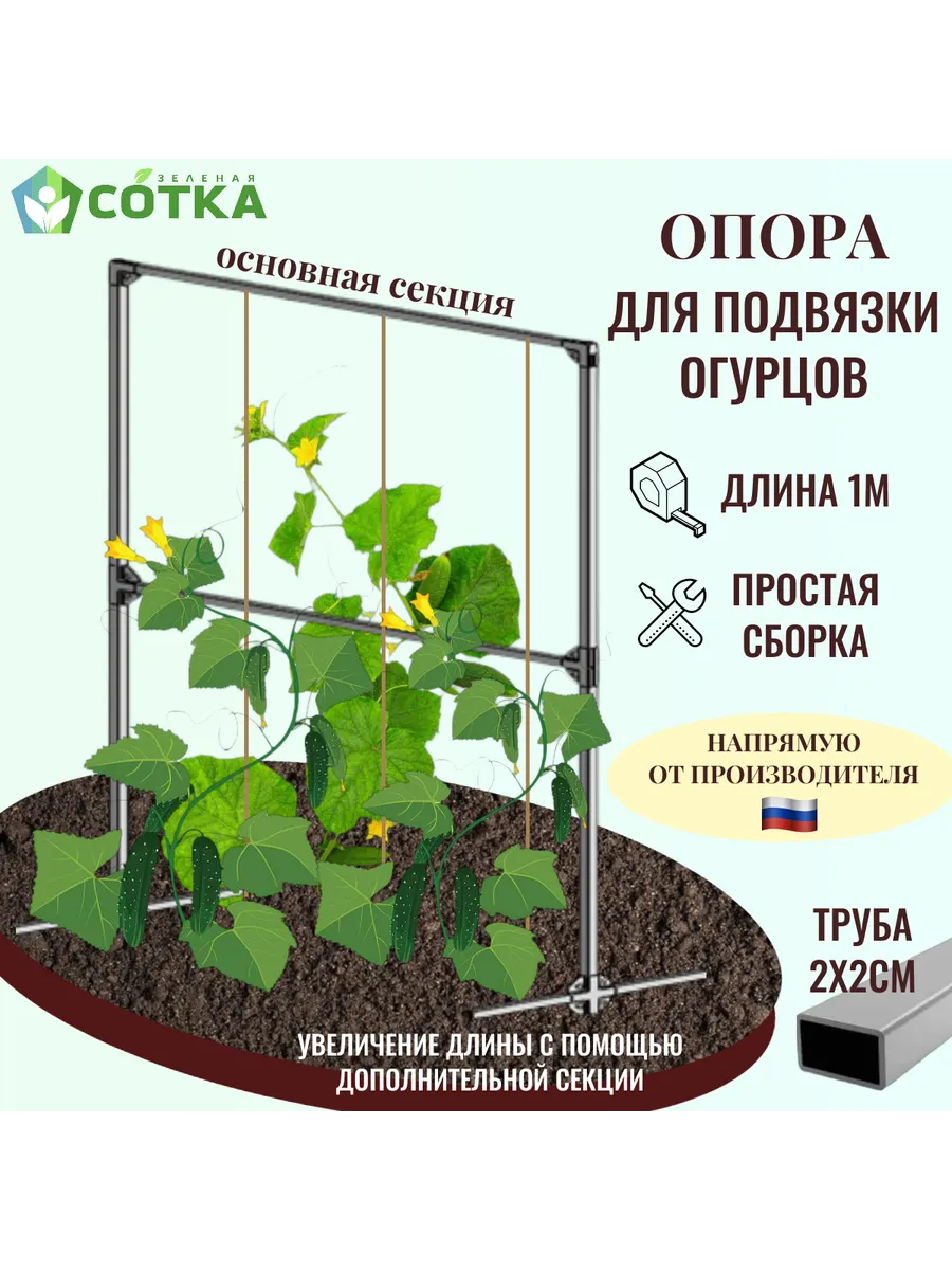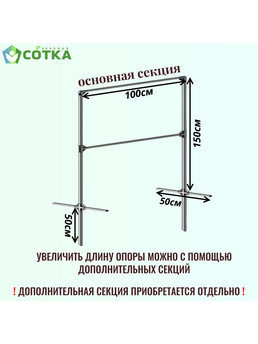 Предусмотрена возможность увеличения длины опоры до необходимого размера. Для этого предназначен дополнительный комплект «Опора для подвязки огурцов (дополнительная секция)»