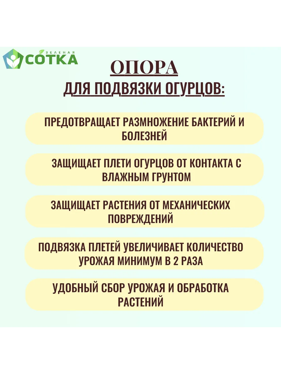 Опора для подвязки огурцов устанавливается в грунт грядок вдоль посадок растений, плети которых подвязываются к горизонтальным перекладинам. Шпагат для подвязки в комплект не входит.