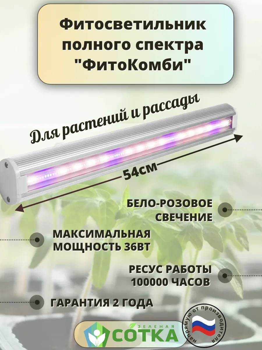 Светильник светодиодный полного спектра "ФитоКомби" от российского бренда «Зеленая сотка» – современное оборудование, обеспечивающее комфортное освещение для быстрого роста растений! Фитолампа произведена из качественных материалов и подходит для выращивания рассады, цветов и комнатных растений. Данные лампы эффективно имитируют солнечное освещение, обеспечивая растениям необходимый спектр для роста и развития. Длина лампы 54см , максимальная мощность 36Вт. Фитосветильник пригоден для использования на стеллажах для рассады, подоконниках и теплицах.