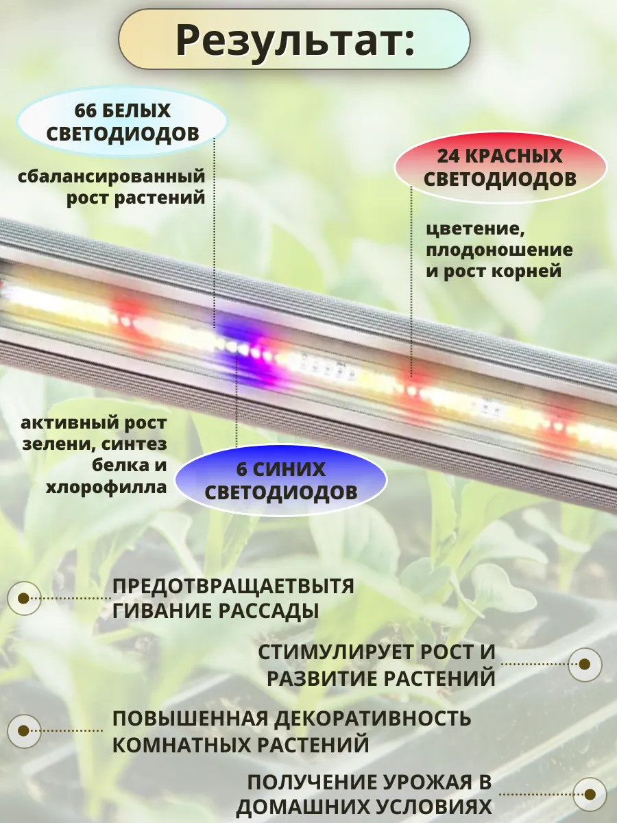 В фитолампе "ФитоКомби" от бренда «Зеленая сотка» оптимально подобрано соотношение количества светодиодов: белых (4000К) -66 шт., красных - 24 шт., синих-6шт.